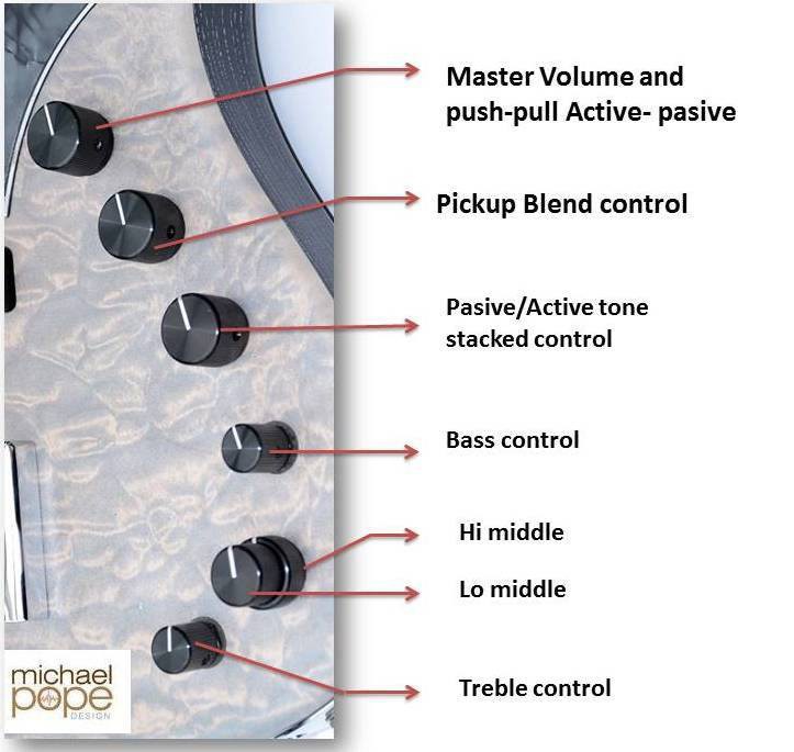 Mike Pope Flexcore / 1 x volume & push-pull active-passive switch / 1 x pickup balance / 1 x tone control (active & passive) / 1 x bass / 1 x mids & mid frequency / 1 x treble /